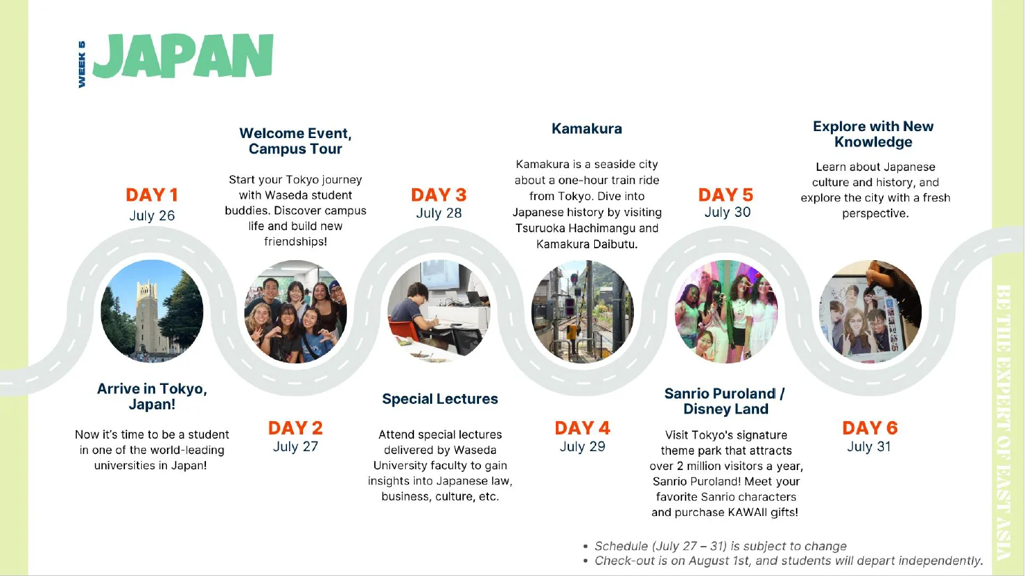 In addition to academic sessions, students will participate in a variety of activities such as a campus tour with Waseda student buddies, cultural excursions to nearby cities including Kamakura, and visits to iconic destinations like Sanrio Puroland or Tokyo Disneyland.