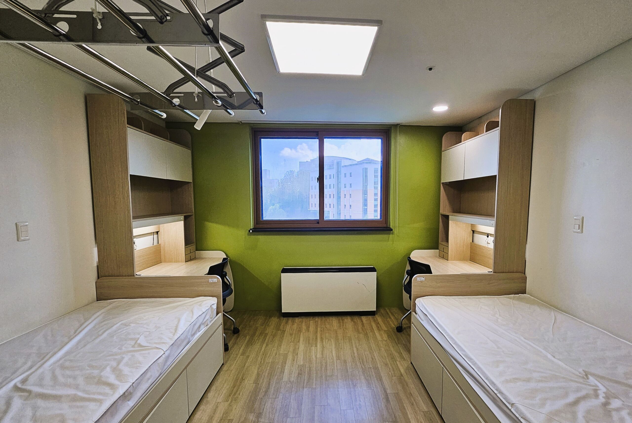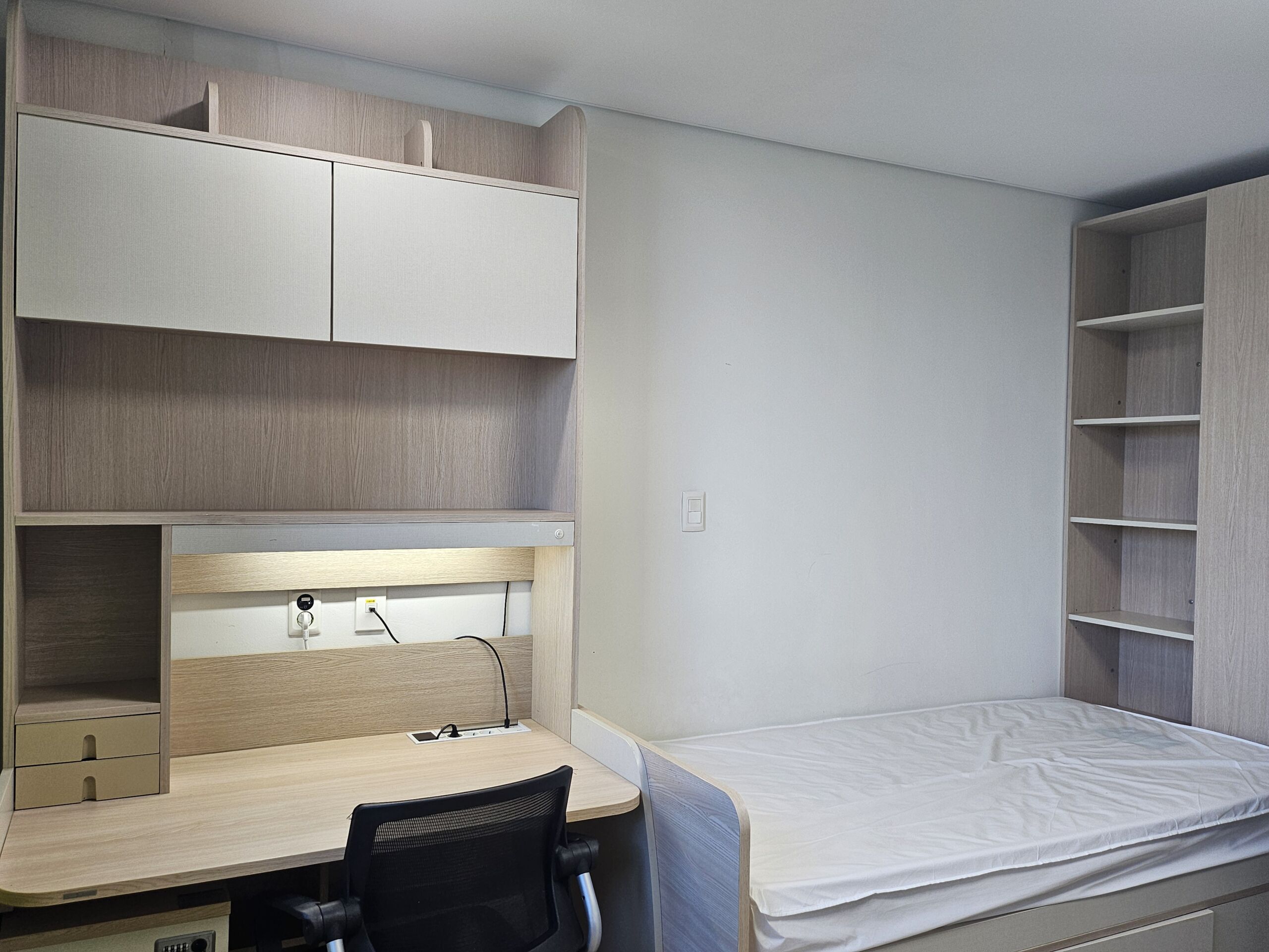- Furnishings: Bed, desk, chair, closet, cabinet, shoe shelf.